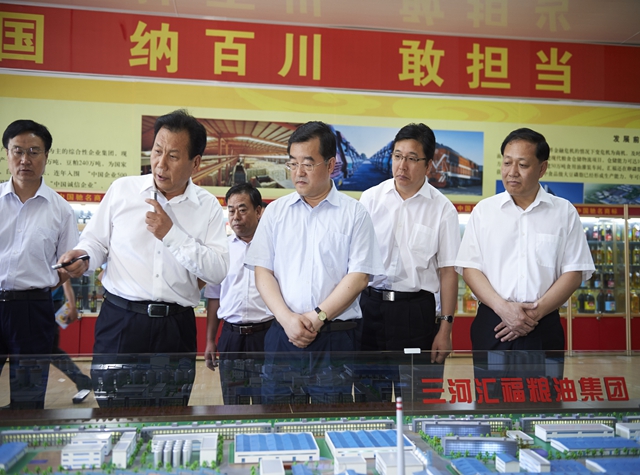 In May 29th, 2014, Vice-president Zhang Qingwei of Agricultural Development Bank of China branch in Hebei Province and so on accompanied by Feng Shaohui, the mayor of Langfang, Zhang Jinbo, Sanhe municipal Party committee secretary and Mayor Gu Zhenghai, inspected Sanhe Hopefull Grain and Oil Group. The chairman Shi Kerong reported the advanced development to Zhang Qingwei. Zhang Qingwei gave a high praise to the Hopefull enterprise.